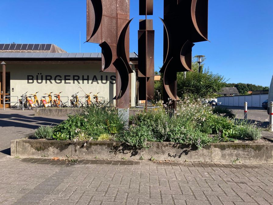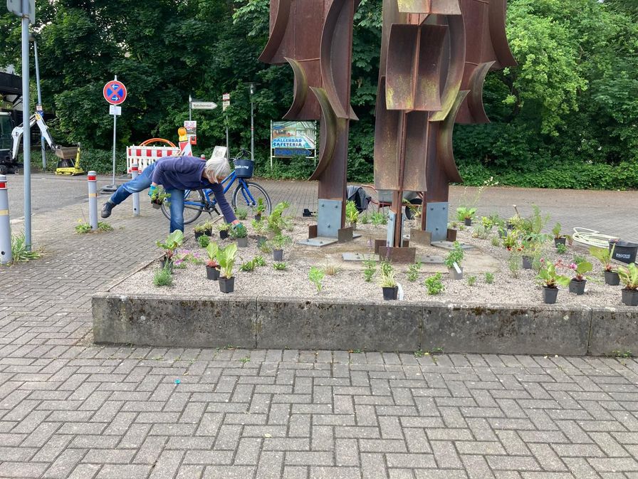 Das dachte sich die Budenheimer Gartenplanerin Elke Blänsdorf (seit 2022 in Budenheim und fast genauso lang aktives Mitglied im Budenheimer Ortsverband von BÜNDNIS 90/DIE GRÜNEN) als sie vor dem Budenheimer Bürgerhaus das große Kunstwerk in einem eher vertrockneten Beet sah und beschloss aktiv zu werden.