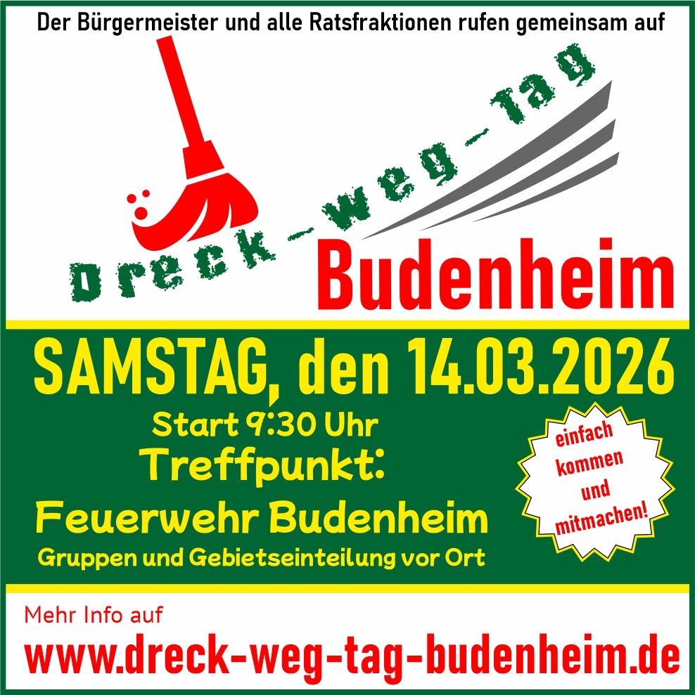 Klaus Neuhaus organisiert den Dreck-Weg-Tag am 14.3., wie schon die Jahre zu vor und vom Bürgermeister über die Feuerwehr bis zu den Gemeindewerken, die "Chemische", die Woinoose und alle Ratsfraktionen helfen mit, und das mit tatkräftiger Unterstützung der Budenheimer*innen und Budenheimer, ob groß ob klein, ob alt ob jung - alle können mitmachen.